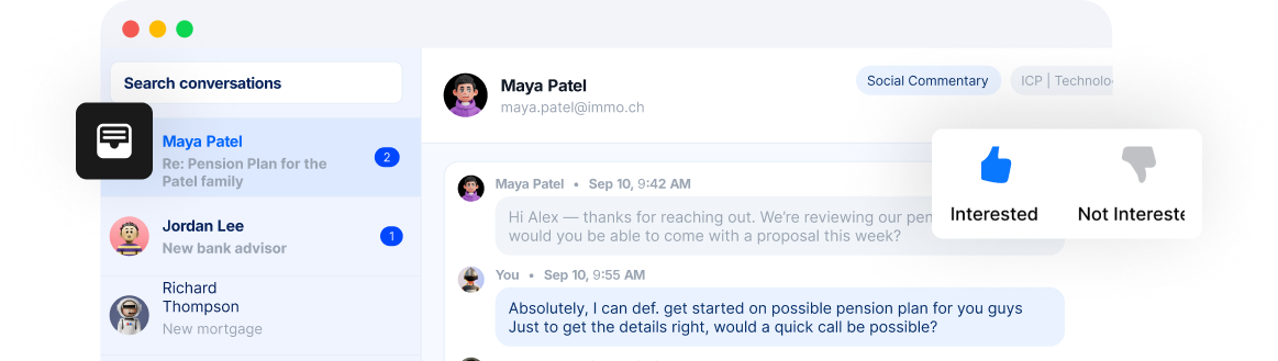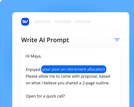Wealthiee is an AI-powered smart prospecting platform designed specifically for financial advisors, wealth managers, insurance brokers, investment bankers, and other financial professionals. Our platform helps you identify high-value prospects that match your ideal client profile, automate personalized outreach, and build lasting relationships with clients who are the perfect fit for your services. Whether you’re an independent advisor or part of a larger team, Wealthiee streamlines your business development process so you can focus on what you do best – Serving your clients.